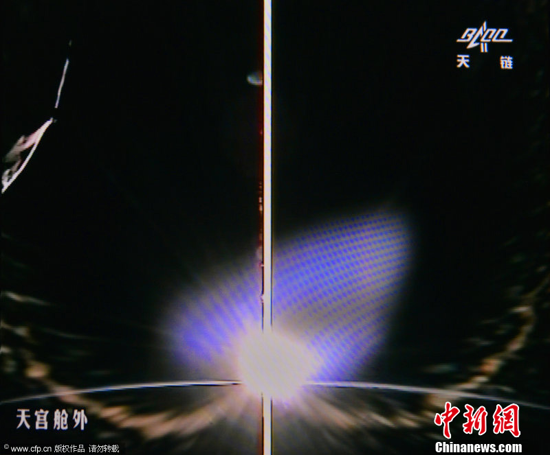 图为从天宫一号和神舟十号看到的太空奇异眩光。(视频截图)图片来源:CFP视觉中国