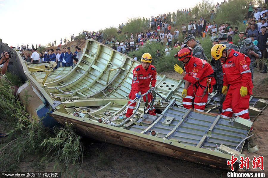 6月11日17时38分,神舟十号飞船在甘肃酒泉卫星发射中心成功发射,16分钟后整流罩坠落榆林。19时00分,残骸搜索组在金鸡滩镇白舍牛滩一片空地上发现了首片整流罩残骸,宽6米长约12米。安装在整流罩中的“黑匣子”也被找回,并在第一时间被相关部门技术人员取走,而其余的残骸还正在搜索中。刘继远 摄 图片来源:CFP视觉中国