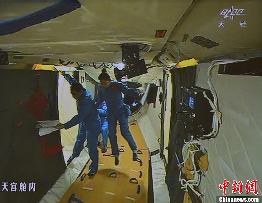 北京时间6月13日16时17分,神舟十号航天员成功开启天宫一号目标飞行器舱门,聂海胜、张晓光、王亚平以漂浮姿态进入天宫一号。据了解,在天宫一号与神舟十号组合体飞行期间,3名航天员将开展多项空间科学实验和技术试验活动,为后续空间站工程建设积累经验。中新社发 秦宪安 摄