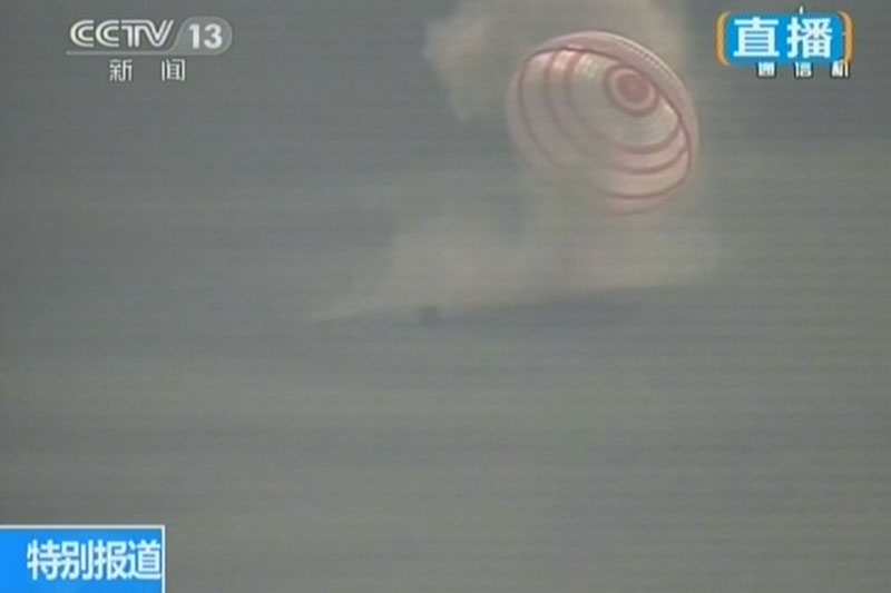 6月26日上午,神舟十号载人飞船返回舱返回地面。图为神十返回舱成功着陆。(视频截图)