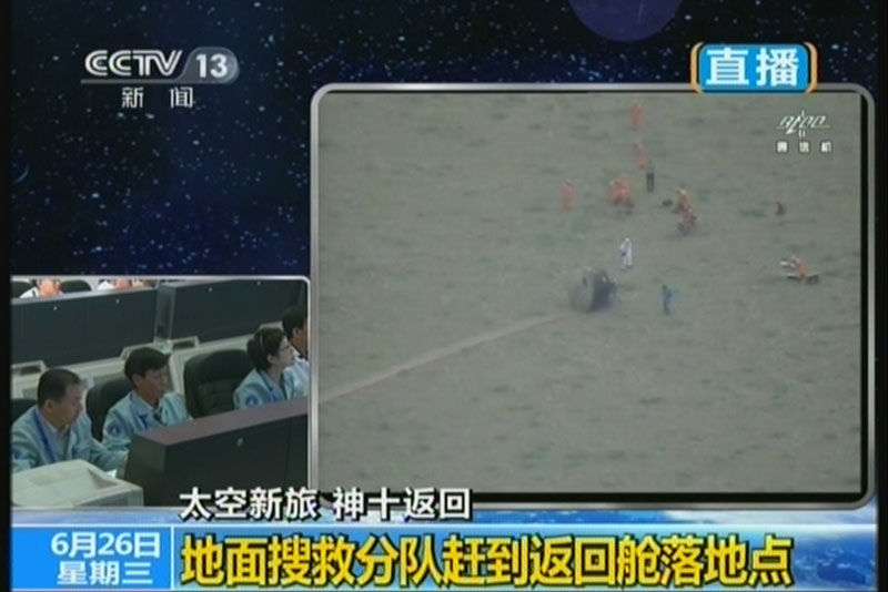 6月26日上午,神舟十号载人飞船返回舱返回地面。图为地面搜救分队赶到神十返回舱落地点。(视频截图)
