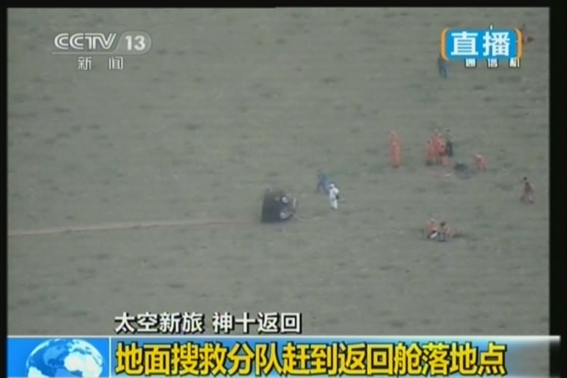 6月26日上午,神舟十号载人飞船返回舱返回地面。图为地面搜救分队赶到神十返回舱落地点。(视频截图)