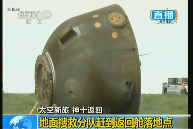6月26日上午,神舟十号载人飞船返回舱返回地面。图为地面搜救分队赶到神十返回舱落地点。(视频截图)