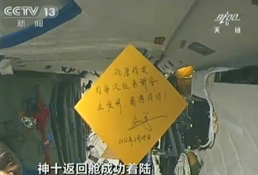 神九航天员留给神十航天员的“太空礼物”曝光。(视频截图)