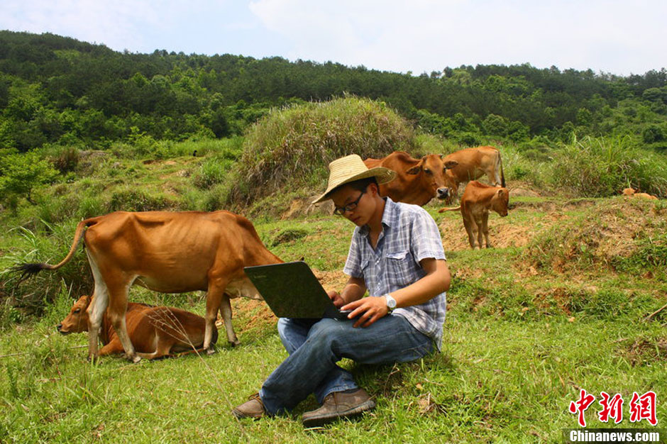 2012年5月22日,湖北黄冈,“90后”大学毕业生贺根放弃教师的工作,回到老家,大规模养殖黄牛,当起了牛倌。在山坡上放牛的间隙,他打开笔记本电脑学习养牛,了解行情。楚杰 摄 图片来源:CFP视觉中国