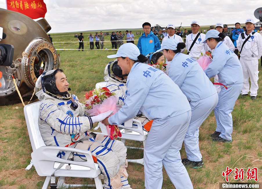 6月26日上午,内蒙古中部草原“神十”任务主着陆场,“神十”载人飞船返回舱顺利着陆,地面人员向航天员献花。中新社发 秦宪安 摄