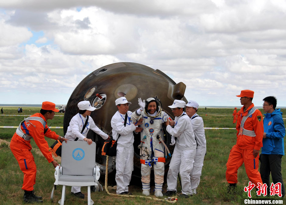6月26日,神舟十号载人飞船返回舱在内蒙古中部主着陆场安全着陆,飞行乘组3名航天员顺利出舱、身体状况良好。至此,备受瞩目的天宫一号与神舟十号载人飞行任务取得圆满成功。图为“神十”任务指令长聂海胜出舱。中新社发 孙自法 摄