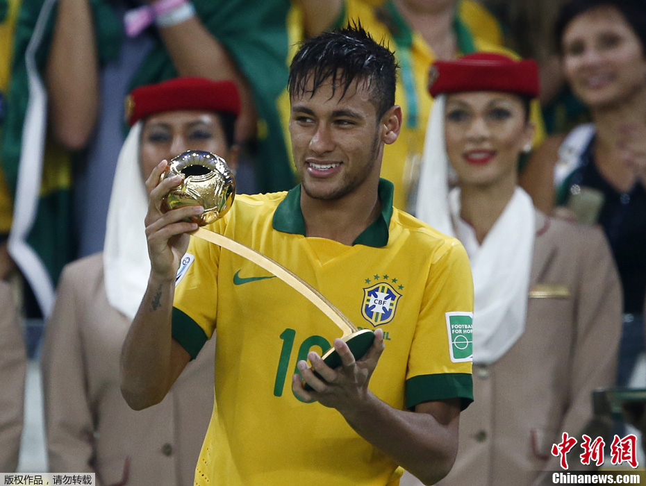 北京时间7月1日6时(巴西当地时间6月30日19时),联合会杯决赛在里约热内卢马拉卡纳球场打响,巴西3比0完胜西班牙,成为联合会杯首支3连冠球队。图为内马尔获得金球奖。