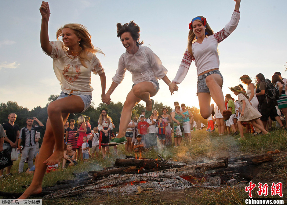 当地时间2013年7月6日,乌克兰基辅,民众跳火堆欢庆伊万库帕拉节。伊万库帕拉节是古老的传统节日,节日上人们通过跳过火堆、下河沐浴等活动祈求身体健康。