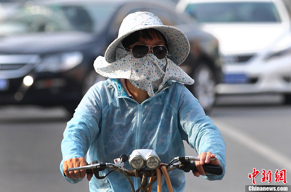 7月30日,南京市民“全副武装”骑车在炙烤的街头经过。当日,中国天气网发布信息,预计7月30日至8月8日,江淮、江南以及重庆等地仍将出现较大范围日最高气温超过35℃的高温天气。其中江南部分地区持续高温日数可达5-8天,部分城市可突破高温历史极值。中新社发 泱波 摄