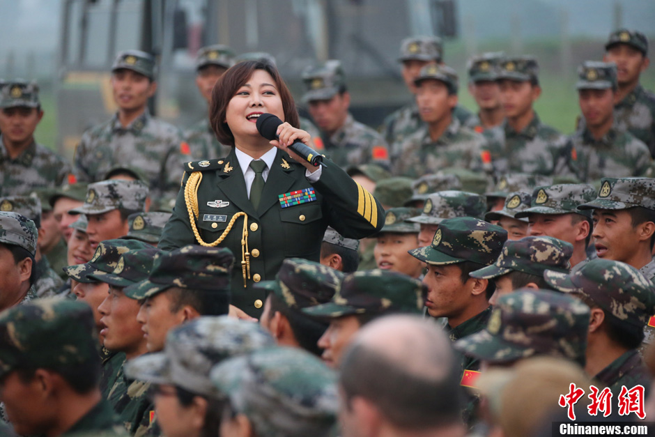 8月10日,随同中方参演部队赴俄罗斯参加“和平使命-2013”中俄联演的沈阳军区政治部文工团演员们,为中俄千余名参演官兵献上了一场精彩的文艺晚会。丰富多彩的文艺节目,将位于切巴尔库尔训练场的中俄联演野营村,变成了友谊的盛会、欢乐的海洋。 图为演唱歌曲《当那一天来临》。中新社发 李祥辉 摄