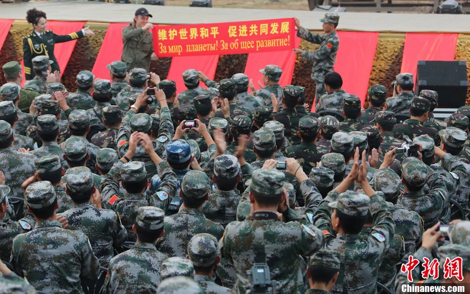 8月10日,随同中方参演部队赴俄罗斯参加“和平使命-2013”中俄联演的沈阳军区政治部文工团演员们,为中俄千余名参演官兵献上了一场精彩的文艺晚会。丰富多彩的文艺节目,将位于切巴尔库尔训练场的中俄联演野营村,变成了友谊的盛会、欢乐的海洋。图为精彩节目吸引俄国官兵。中新社发 李祥辉 摄