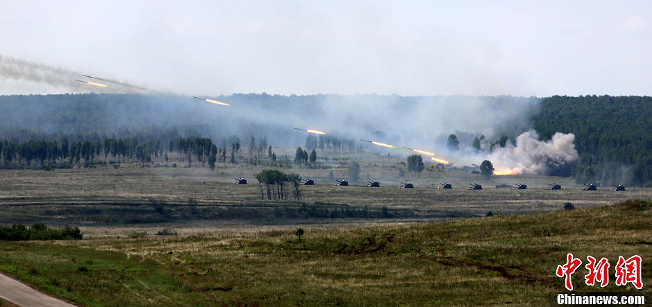 8月12日,“和平使命-2013”联合反恐军演中俄两军参演部队在切巴尔库尔合同训练场举行全员全要素实兵协同训练。双方共出动官兵近900人,坦克、步战车、直升机等武器装备约130台,双方导演部总导演——俄中部军区司令员波格诺夫斯基和沈阳军区副司令员石香元,共同到演习地观摩并指导两军训练。中新社发 李祥辉 摄