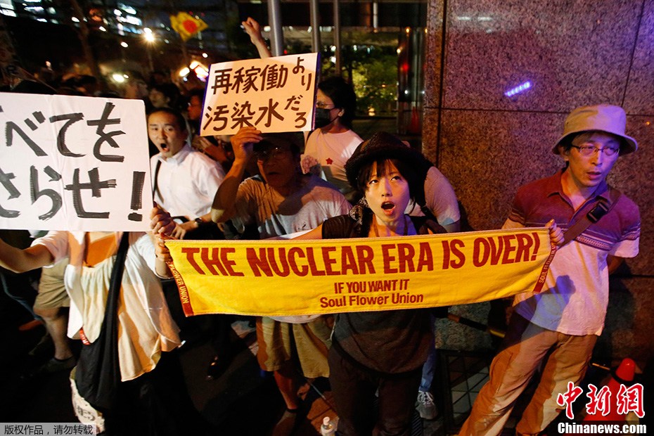 当地时间2013年8月28日,日本东京,示威者聚集在东京电力公司前,抗议福岛核电站污水泄露。