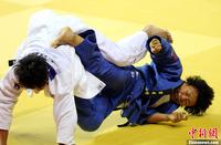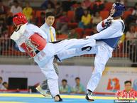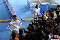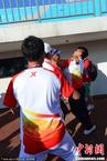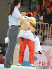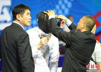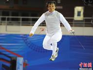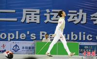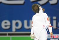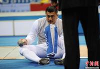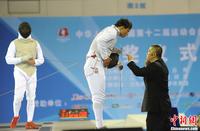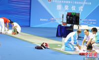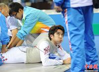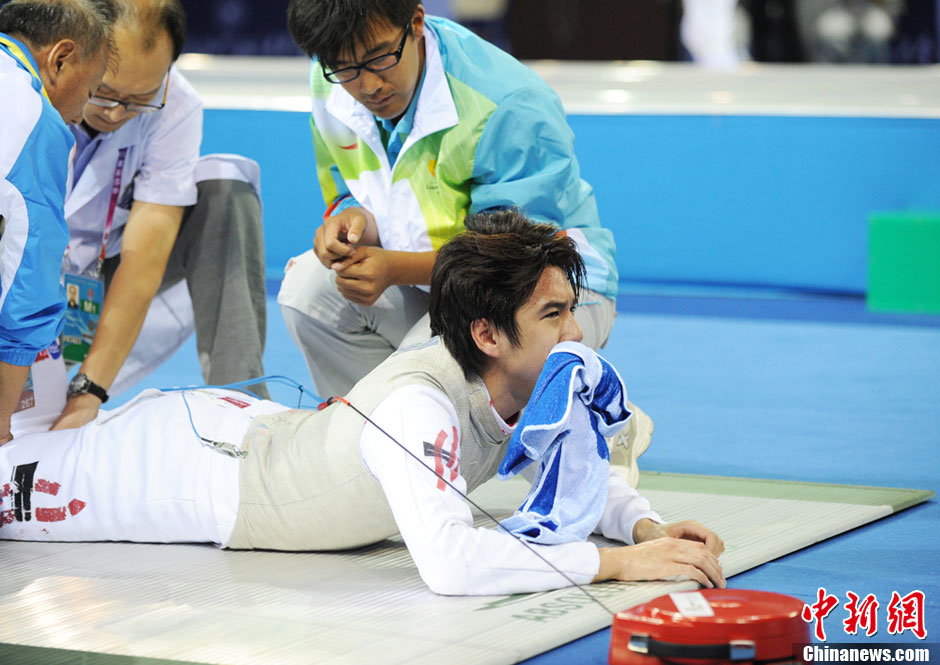 9月2日,第十二届全运会男子花剑个人赛在沈阳航空航天大学体育馆举行。香港选手崔浩然在1/4决赛中腿部抽筋,现场接受治疗。中新网记者 李美多 摄