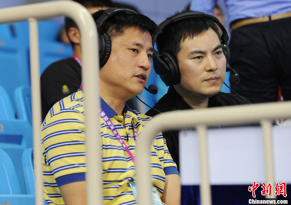 9月2日,第十二届全国运动会击剑比赛第二日。中国击剑元老级人物,现任中国男子花剑队主教练的王海滨(左),担任比赛解说嘉宾。中新网记者 李美多 摄