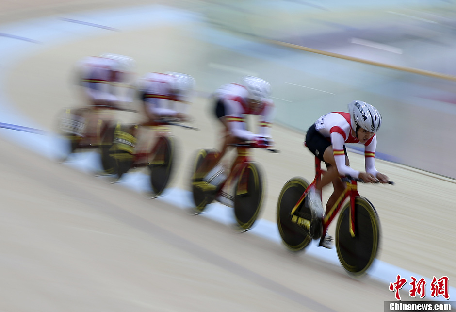 9月3日,河南队队员岳昊、赵一鸣、王晓航、王丰年在自行车男子场地团体追逐赛半决赛中。当日,第十二届全运会场地自行车赛开赛。中新社发 刘关关 摄
