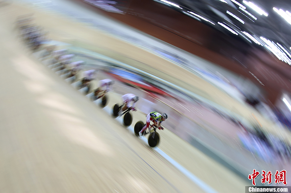 9月3日,参加第十二届全运会场地自行车赛的选手在赛道上热身。当日,第十二届全运会场地自行车赛开赛。中新社发 刘关关 摄