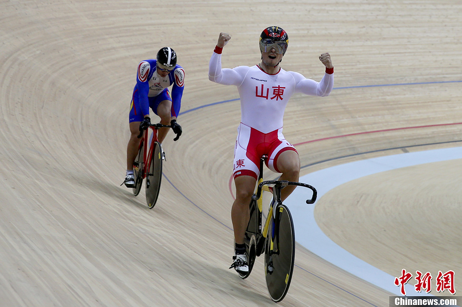 9月3日,山东队队员成昌松庆祝胜利。当日,在沈阳举行的第十二届全运会自行车男子场地团体竞速赛中,山东队获得冠军。中新社发 刘关关 摄