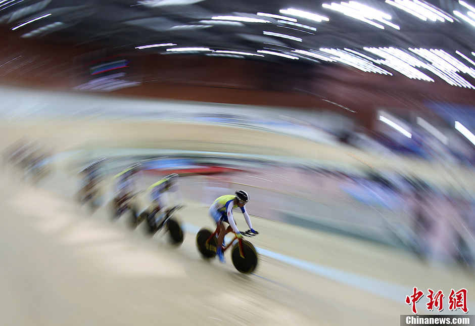 9月3日,参加第十二届全运会场地自行车赛的选手在赛道上热身。当日,第十二届全运会场地自行车赛开赛。中新社发 刘关关 摄