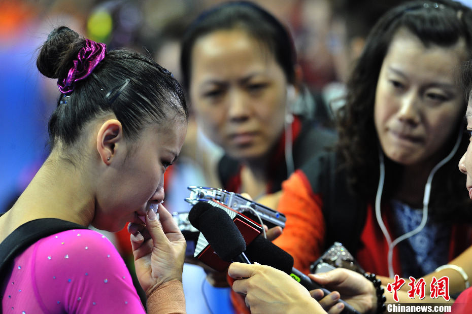 9月4日晚,大连,北京队著名奥运冠军何可欣,在第十二届全运会女子体操团体决赛中连连失手,退场后含泪面对媒体的严峻询问。中新社发 贾国荣 摄