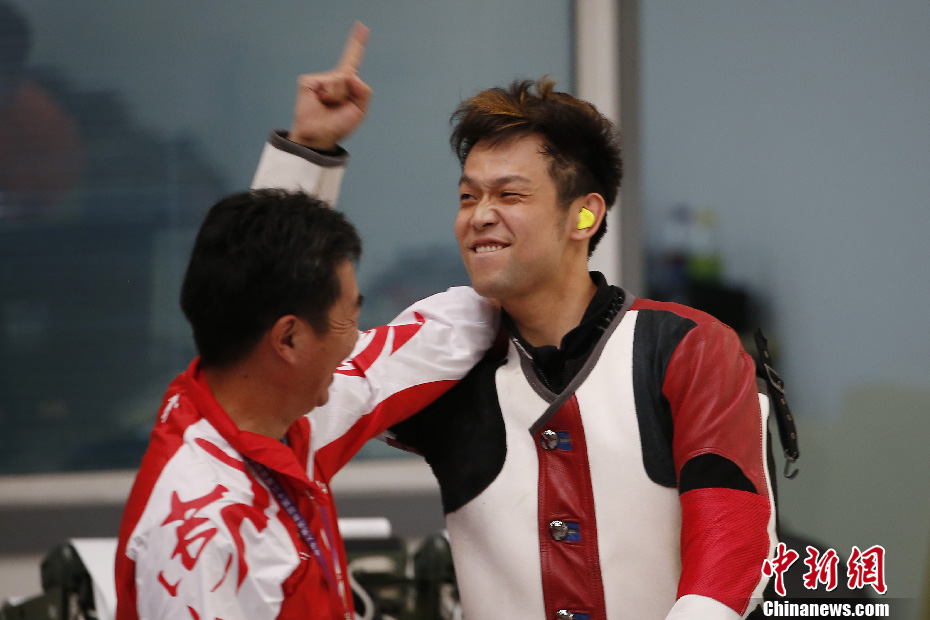 9月5日,第十二届全国运动会男子50米步枪三种姿势决赛在沈阳进行,朱启南在前两种姿势一直处于落后,但他凭借立射的出色表现实现逆转,最终夺取金牌。图为朱启南在比赛后庆祝胜利。中新社发 盛佳鹏 摄