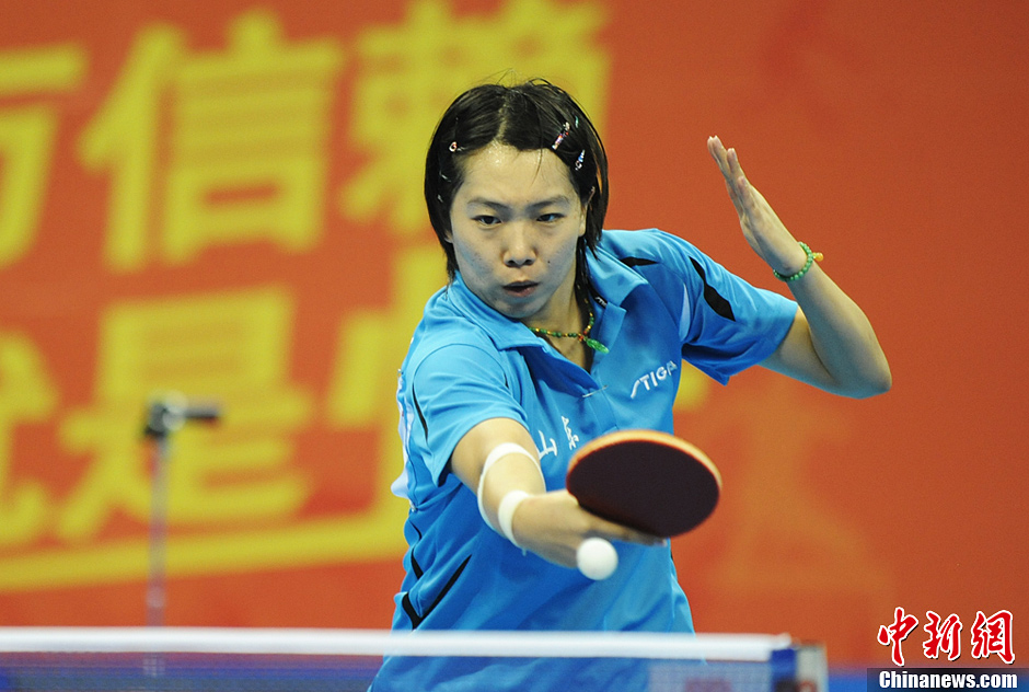 2013年9月5日,第12届全国运动会乒乓球女团决赛在鞍山奥体中心体育馆举行,山东队的李晓霞在比赛中。当日,山东队以3:0战胜山西队夺冠。中新网记者 李美多 摄