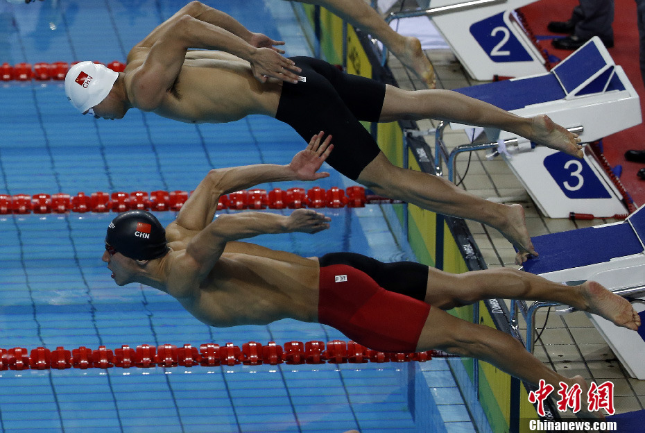 9月5日,第十二届全国运动会男子4x100米自由泳接力决赛,运动员如飞鱼入水。中新社发 张家瑞 摄
