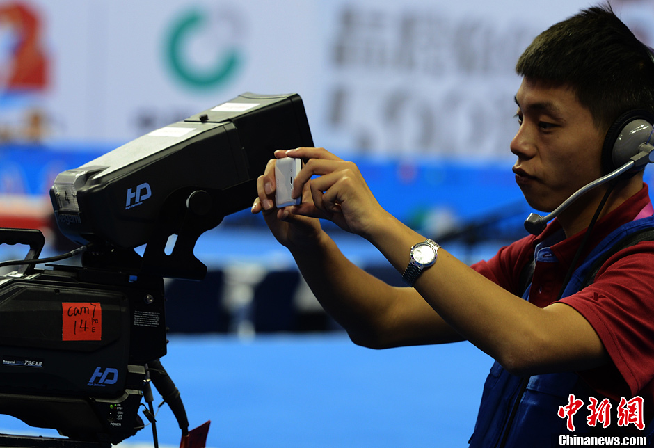 9月5日晚的大连,一位电视直播摄影师抽空用手机拍摄自己喜欢的画面。第十二届全运会体操进入男女个人全能和各单项决赛,金牌争夺战白热化。中新社发 刘关关 摄