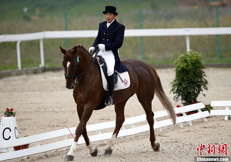 9月6日,第十二届全运会马术盛装舞步团体赛在沈阳苏家屯马术运动中心开赛,作为本届全运会最年长的运动员,66岁的北京老将王越陇第一个登场。中新社发 盛佳鹏 摄