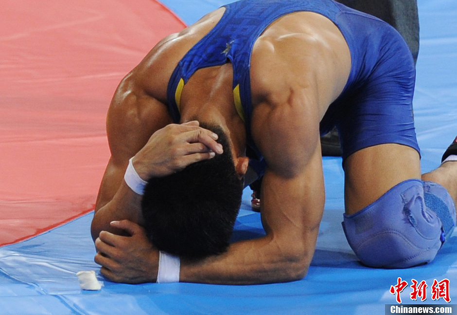 9月6日,第十二届全运会男子古典式摔跤74公斤级决赛在沈阳举行,山东选手杨斌在比赛中折断手指,获得亚军。中新网记者 李美多 摄
