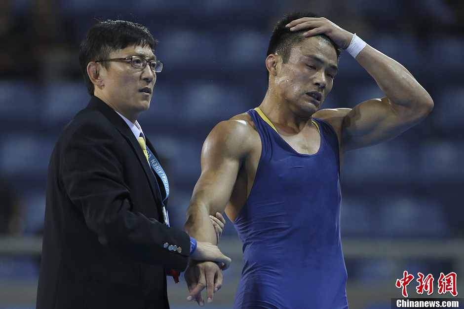 9月6日,第十二届全运会男子古典式摔跤74公斤级决赛在沈阳进行,山东选手杨斌(蓝)在比赛中折断手指,最终获得亚军。中新社发 盛佳鹏 摄