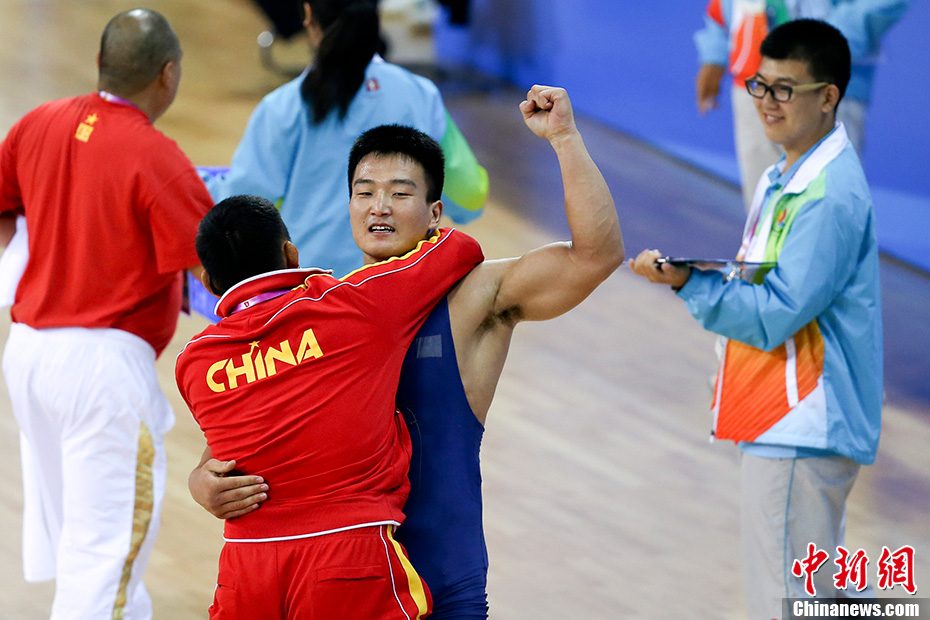 9月7日,第十二届全运会男子古典式摔跤96公斤级决赛在沈阳举行,山东选手肖棣获得冠军。中新社发 刘关关 摄