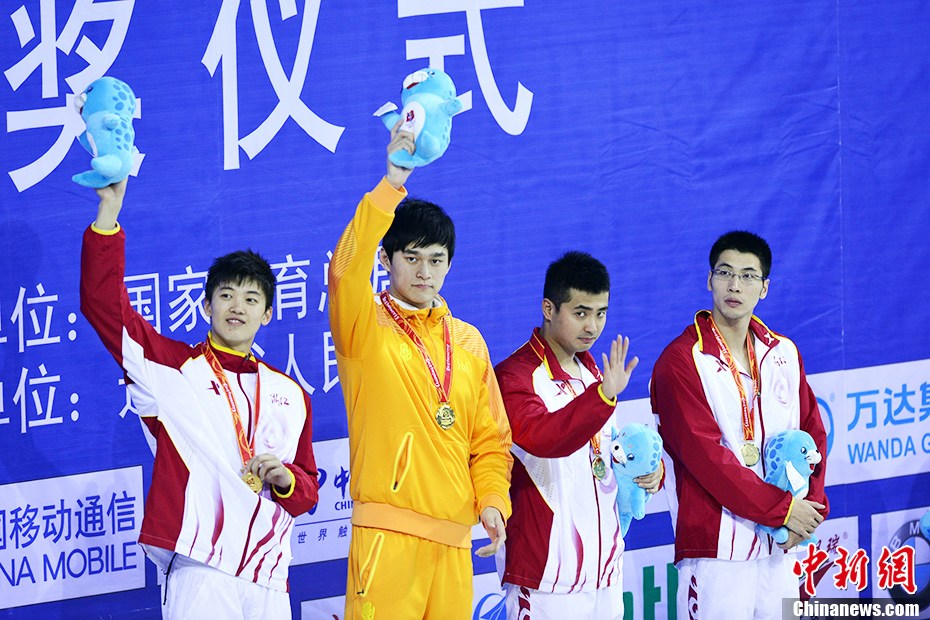9月7日,第十二届全运会男子4x200米自由泳接力决赛在辽宁省体育局浑南训练基地游泳馆举行。浙江队最终以7分12秒79的成绩获得冠军。孙杨也将他本届全运会的第四金收入囊中。图为浙江队左起汪顺、孙杨、吴鹏、吕志武登上冠军领奖台。中新社发 于海洋 摄