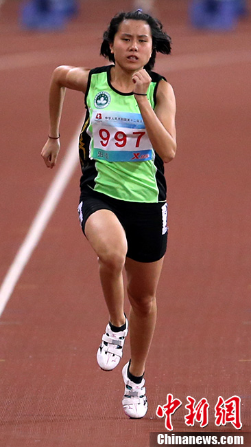 9月7日,在沈阳举行的第十二届全运会田径女子100米预赛中,来自澳门的选手胡雅雯参赛。中新社发 张家瑞 摄