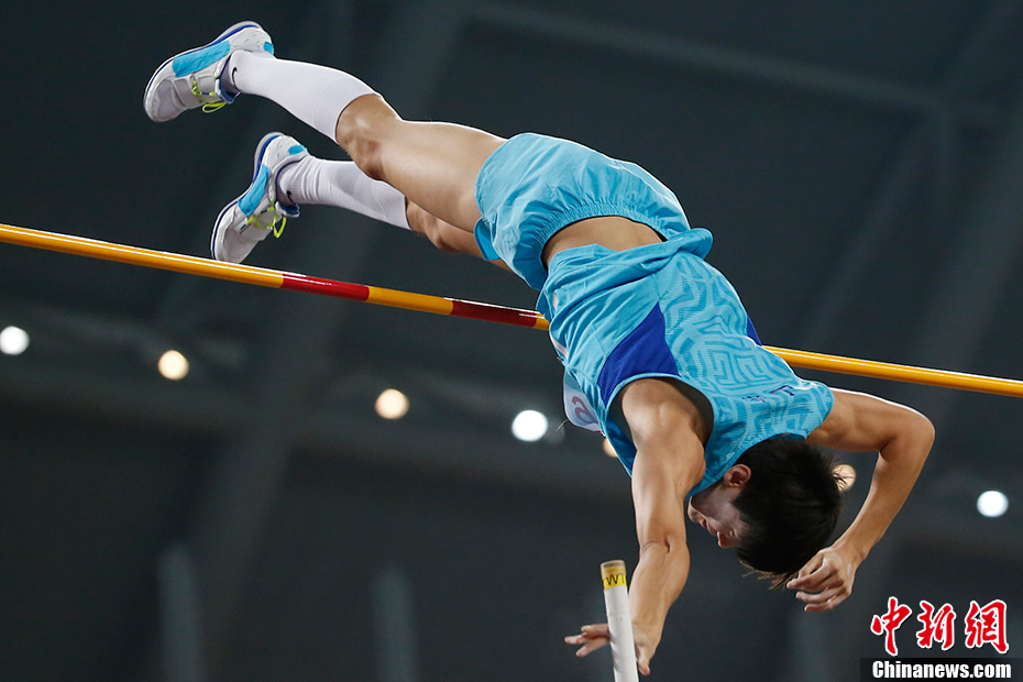9月7日,第十二届全运会男子撑杆跳决赛在沈阳市奥体中心体育场举行,来自山东的薛长锐以5.60米的成绩夺得金牌。中新社发 盛佳鹏 摄
