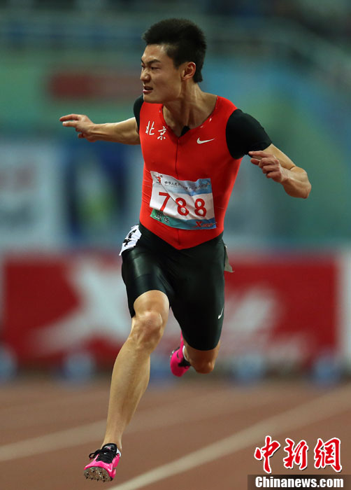 9月8日,第十二届全运会男子100米决赛在沈阳市奥体中心体育场举行。北京选手张培萌以10秒08夺得冠军。张培萌是该项目全国纪录(10秒00)保持者。中新社发 张家瑞 摄