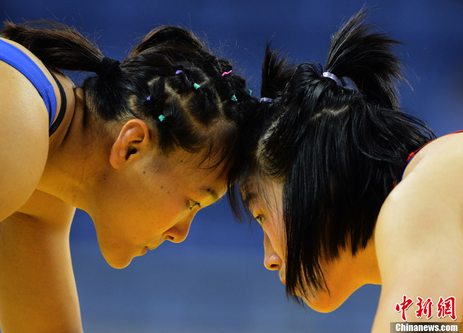 9月8日,沈阳,江西女摔跤手周凤(右)与湖北女将许晴(左),参加第十二届全运会女子72公斤级摔跤奖牌争夺战。中新社发 贾国荣 摄