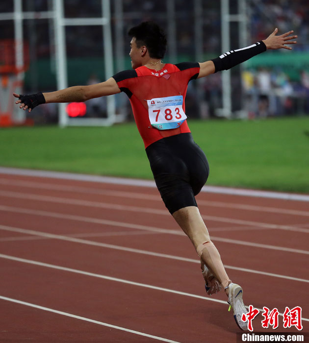 9月8日,在沈阳举行的第十二届全运会男子跳远决赛中,李金哲夺得冠军。中新社发 张家瑞 摄