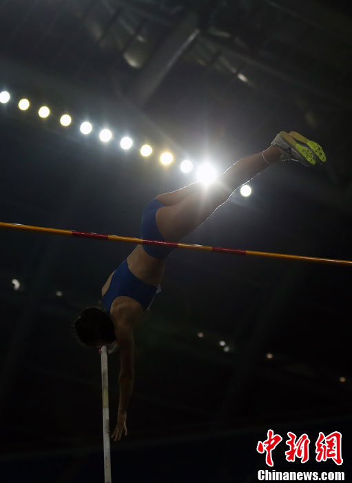 9月8日,在沈阳举行的第十二届全运会女子撑杆跳高决赛中,选手在比赛中全力以赴拼搏。中新社发 张家瑞 摄