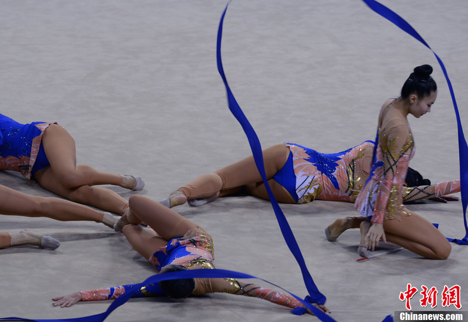 9月9日的沈阳东北大学体育馆,第十二届全运会艺术体操团体比赛争芳斗艳,广西美少女组合的结尾造型。贾国荣 摄
