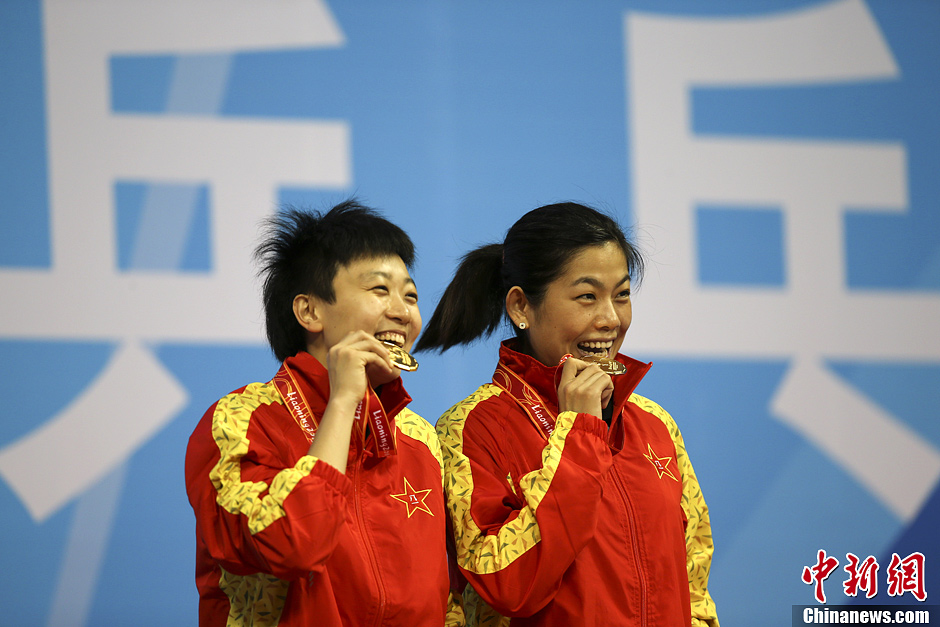 9月9日,第十二届全运会乒乓球比赛女双决赛在辽宁鞍山举行,代表解放军出战的曹臻和木子以4-1击败东道主辽宁组合郭跃和李佳燚夺冠。中新社发 刘关关 摄