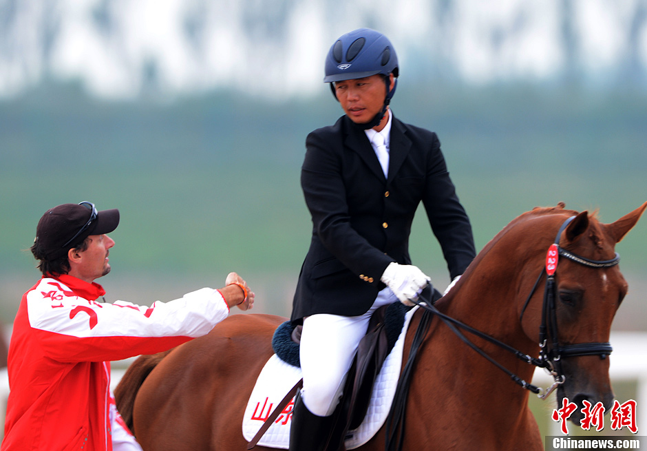 9月9日的沈阳,在第十二届全运会马术三项赛中,山东队聘请的洋教头辅导盛装舞步选手准备上场。中新社发 贾国荣 摄
