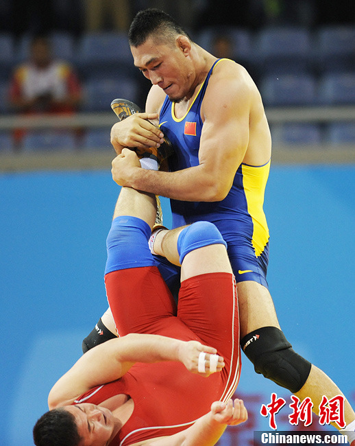 9月9日,第十二届全运会男子自由式摔跤120公斤级决赛在沈阳举行,山西选手梁磊(蓝)夺冠。中新网记者 李美多 摄