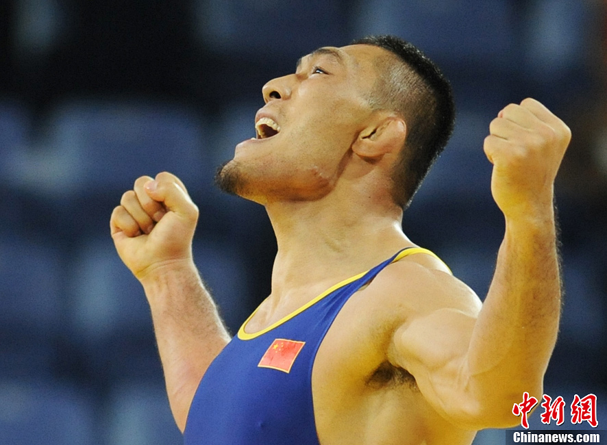 全运会男子自由式摔跤120公斤级 梁磊夺冠后庆祝