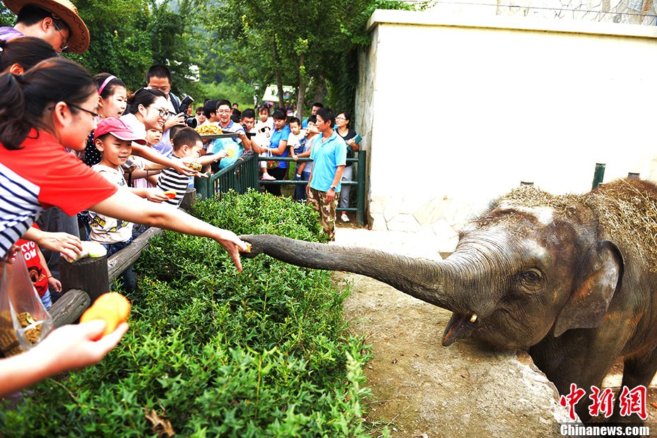 9月15日上午,15家热爱动物的家庭来到无锡动物园内,利用各种水果、蔬菜、窝头等食物,为大象、黑猩猩、长颈鹿、节尾狐猴、猕猴、熊等动物制作中秋月饼,现场主要为5-8岁的小朋友,大家充分发挥自己的想象力,在爸爸妈妈的指导下DIY了动物月饼,提前给小动物们过了一个有意义的中秋节。图为家长陪同孩子喂食大象。中新社发 李一芳 摄