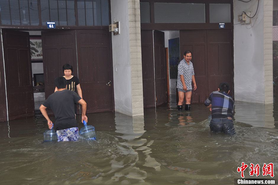 10月9日,浙江余姚湖舍里自然村村民急缺饮用水,该村村干部划着船,为每家每户发放饮用水。尽管今年第23号强台风“菲特”7日上午9时已在福建省建瓯市境内减弱为热带低压,但其风声小雨点大的特点犹如隔山打牛,给浙江来了沉重一击,让浙江多地饱受洪涝之苦。中新社发 徐小勇 摄