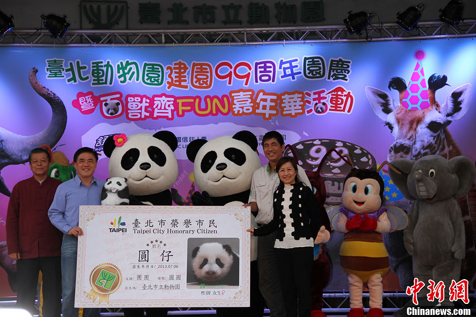 台北市立动物园26日举办99周年园庆,台北市市长郝龙斌公布出生112天的大陆赠台大熊猫宝宝命名为“圆仔”,幷为其颁发荣誉市民证,邀请“圆仔”担任台北市的保育大使。冽玮 摄