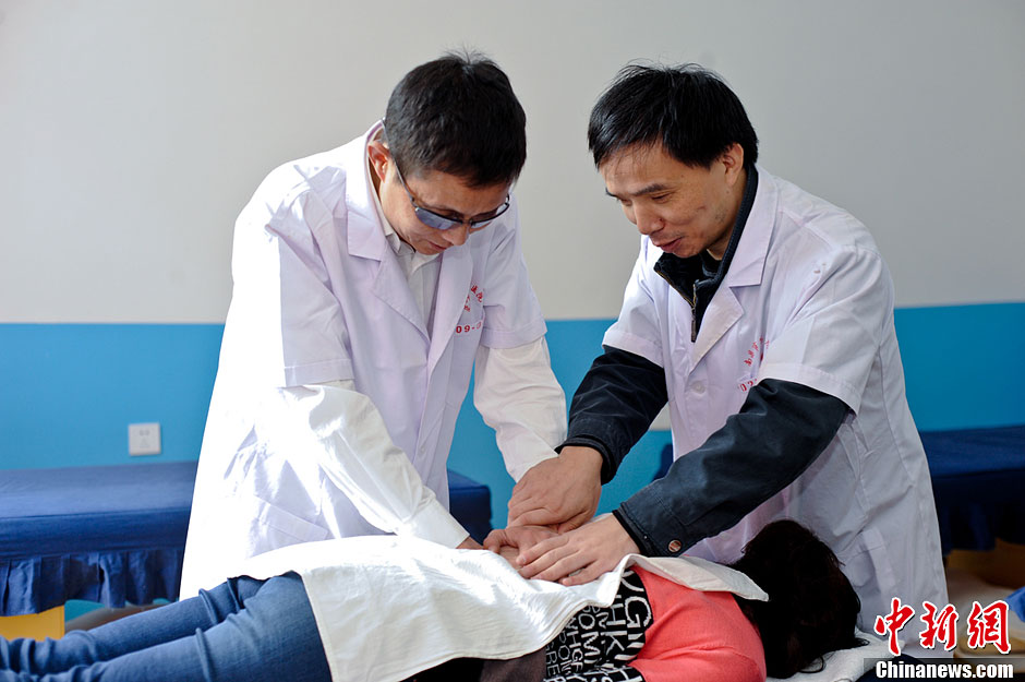 孟国鸣在师傅陈智谋指导下学会按摩技能。张学东 摄