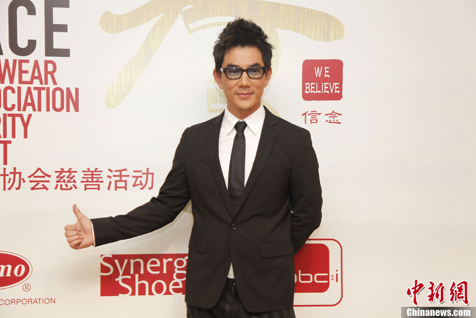 11月4日,任贤齐、靳羽西、种丹妮、姜育恒等明星和2012中国区环球小姐及社会各界爱心人士出席了在上海举行的主题为“2013FACE遇见你,传递爱”的主题爱心活动。图为任贤齐亮相活动现场。中新社发 袁婧 摄